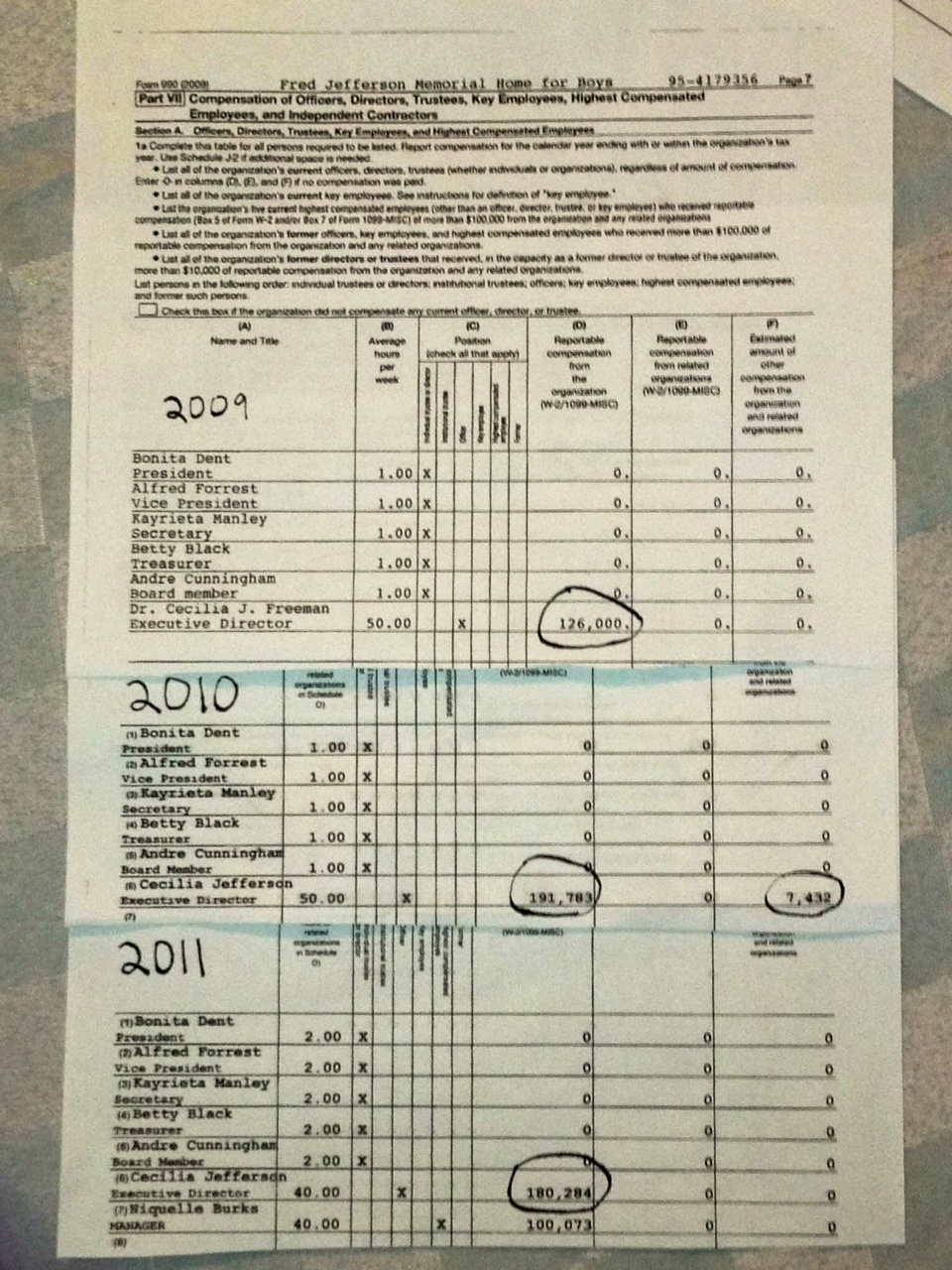 Dr. Cecilla Jefferson, the founder and executive director of Fred Jefferson Memorial Home for Boys, received almost a 58% pay raise from the years 2009 to 2010.